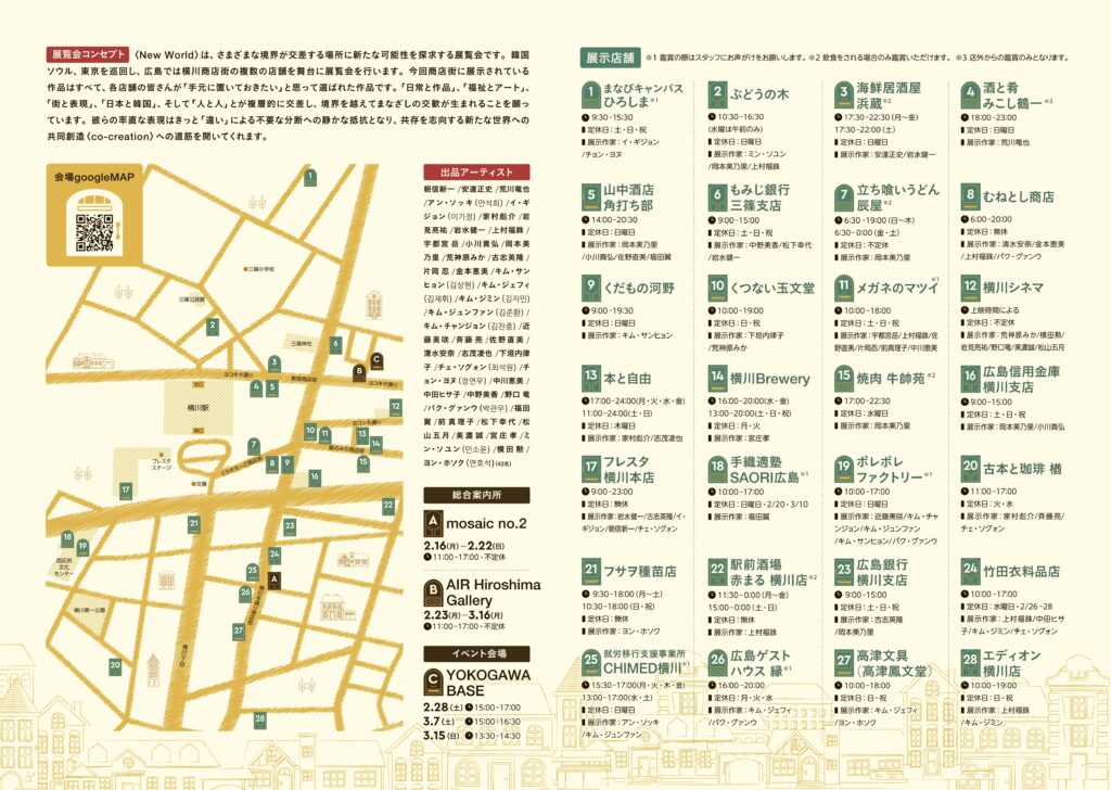 〈New World〉は、さまざまな境界が交差する場所に新たな可能性を探求する展覧会です。韓国ソウル、東京を巡回し、広島では横川商店街の複数の店舗を舞台に展覧会を行います。今回商店街に展示されている 作品はすべて、各店舗の皆さんが「手元に置いておきたい」と思って選ばれた作品です。「日常と作品」、「福祉とアート」、「街と表現」 、「日本と韓国」 、そして「人と人」 とが複層的に交差し、境界を越えてまなざしの交歓 が生まれることを願っています。彼らの率直な表現はきっと「違い」による不要な分断への静かな抵抗となり、共存を志向する新たな世界への 共同創造〈co-creation〉への道筋を開いてくれます。