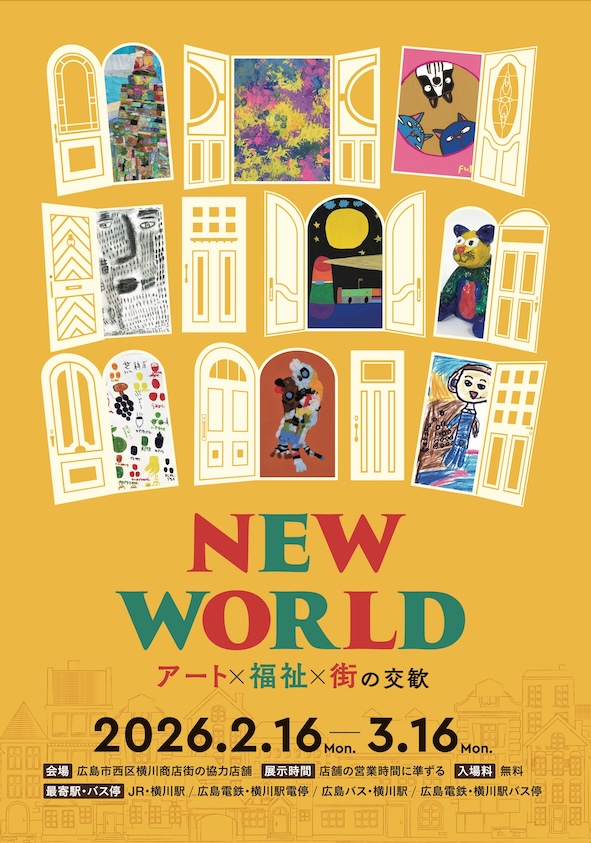 〈New World〉は、さまざまな境界が交差する場所に新たな可能性を探求する展覧会です。韓国ソウル、東京を巡回し、広島では横川商店街の複数の店舗を舞台に展覧会を行います。今回商店街に展示されている 作品はすべて、各店舗の皆さんが「手元に置いておきたい」と思って選ばれた作品です。「日常と作品」、「福祉とアート」、「街と表現」 、「日本と韓国」 、そして「人と人」 とが複層的に交差し、境界を越えてまなざしの交歓 が生まれることを願っています。彼らの率直な表現はきっと「違い」による不要な分断への静かな抵抗となり、共存を志向する新たな世界への 共同創造〈co-creation〉への道筋を開いてくれます。
