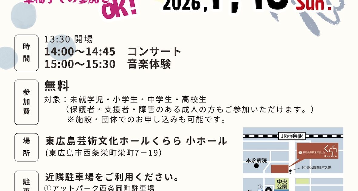音楽療法士の香川様よりコンサートのお知らせをいただきました。 音楽療法士によるファミリーコンサート 日時:2026年1月18日(日) 13:30 開場 14:00~14:45 コンサート開演 15:00~ […]